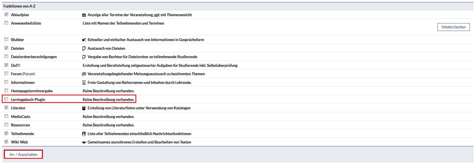 Aktivieren Sie mit dem Setzten eines Häkchens am Lerntagebuch-Tool und mit dem Speichern Ihrer Einstellung das PlugIn.
