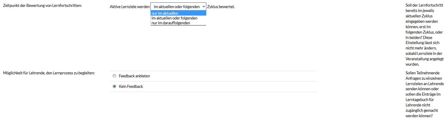 Die Intervallänge bestimmt, in welchen Abständen Lernziele im Lerntagebuch definiert und bewertet werden. Diese Einstellung lässt sich nicht mehr ändern, sobald Lernziele angelegt wurden.