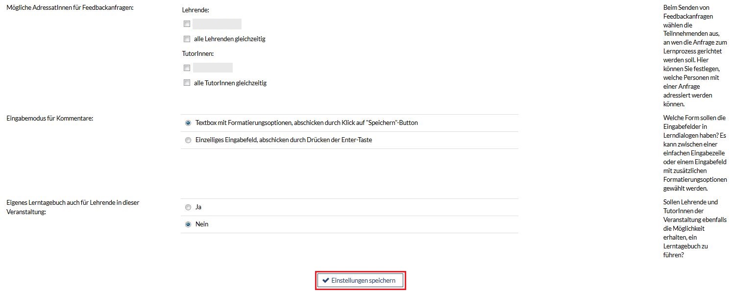 Auf der Administrationsseite des Plugins werden die Funktionen der Lerntagebücher in der jeweiligen Veranstaltung konfiguriert.
