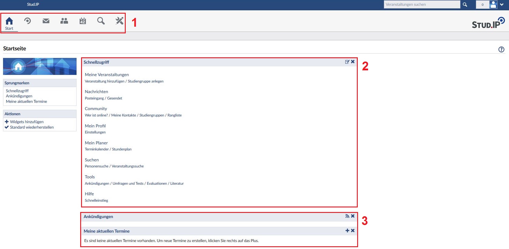 Nach jedem erfolgreichen LogIn in Stud.IP erreichen Sie Ihre persönliche Startseite. Die Seite dient als Sprungbrett für Ihre weiteren Aktionen in Stud.IP.