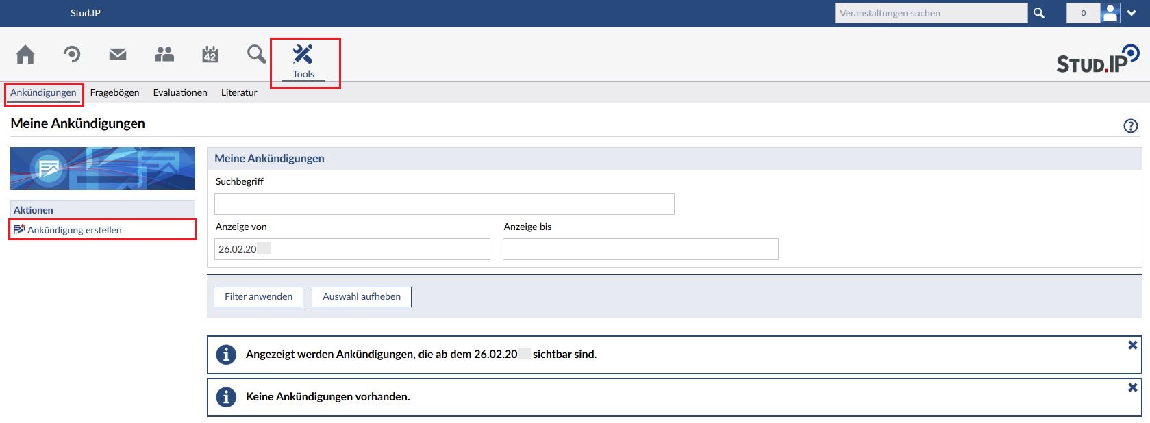 Ankündigungen über Tools erstellen Alternativ hierzu können Sie auch im Bereich "Tools" den Reiter "Ankündigungen" wählen und hier über die Schaltfläche "Ankündigung erstellen" in der Sidebar auf der linken Seite eine neue Ankündigung anlegen: