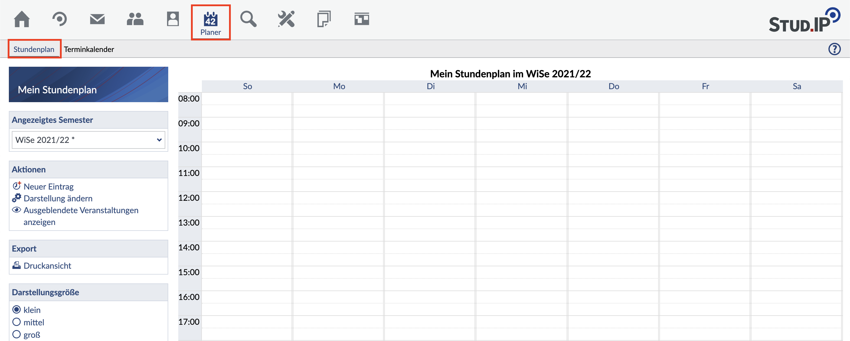 Sie erreichen Ihren Stundenplan indem Sie den "Planer" Button auf der StudIP Startseite wählen und anschließend auf "Stundenplan" klicken.