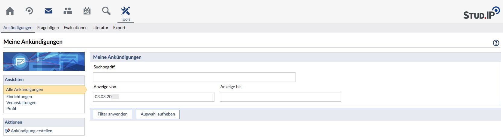 Alternativ hierzu können Sie auch im Bereich "Tools" den Reiter "Ankündigungen" wählen und hier über die Schaltfläche "Ankündigung erstellen" in der Sidebar auf der linken Seite eine neue Ankündigung anlegen: