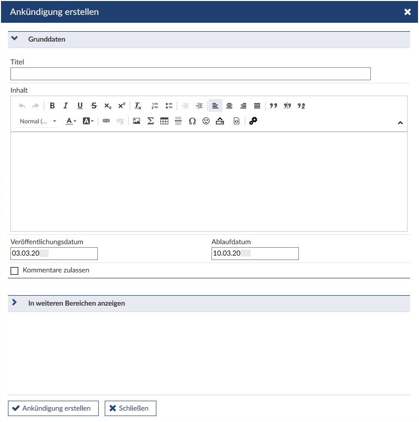 Sie können nun eine Überschrift und einen Text für Ihre Ankündigung eingeben. Mit den Schaltflächen "Veröffentlichungsdatum" und "Ablaufdatum" bestimmen Sie, ab wann und bis wann die Ankündigung angezeigt werden soll. Außerdem können Sie festlegen, ob zu Ihrer Ankündigung Kommentare zugelassen werden sollen oder nicht. Setzen Sie einen Haken, wenn Kommentare erlaubt sein sollen bzw. setzen Sie keinen Haken, wenn Sie keine Kommentare zulassen möchten. Wenn Sie eine Ankündigung über Ihre Profilseite erstellen, ist automatisch ausgewählt, dass die Ankündigung im Ihrem Profil erscheint. Sind Sie Tutor*in einer Veranstaltung oder sogar Dozent*int an einer Einrichtung, können Sie Ankündigungen auch dort anzeigen lassen. Dazu klicken Sie auf "In weiteren Bereichen anzeigen" und können dann unter "Suchvorlagen" z.B. eine Einrichtung auswählen oder die Suchfunktion nutzen. Im rechten Bereich sehen Sie, wo genau Ihre Ankündigung angezeigt wird. Klicken Sie abschließend auf "Ankündigung erstellen".