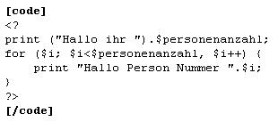 Es gibt auch einen Tag, mit dem Programmcodes in Foren gut sichtbar gemacht werden können. Benutzen Sie dafür den Ausdruck [code]