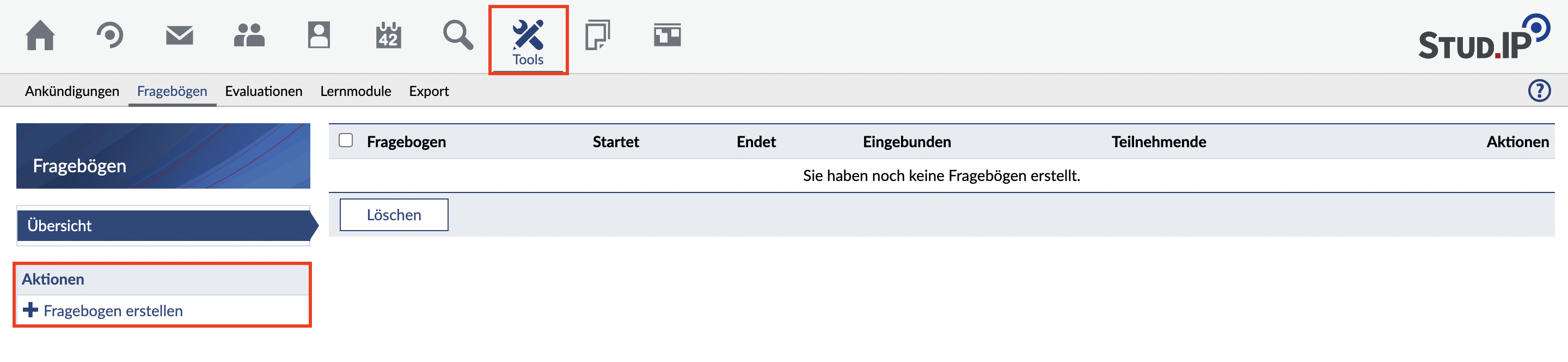 Eine Möglichkeit, bietet der Weg über die Tool-Funktion in der Menüleiste. Unter der Registerkarte "Fragebögen" gelangen Sie zum Fragebogen-Tool. Über diese Funktion können Sie später auswählen, wo der Fragebogen angezeigt wird.