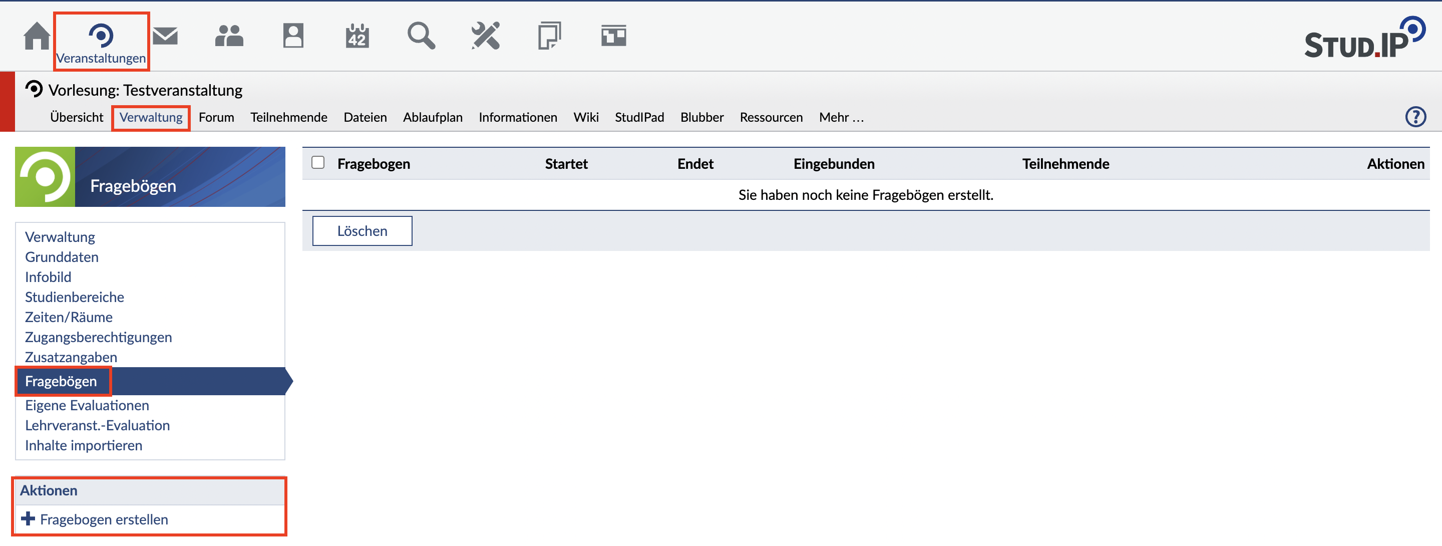 Sie können auch direkt in einer Veranstaltung einen Fragebogen anlegen. Dieser ist so nur für die Teilnehmenden dieser Veranstaltung zugänglich.