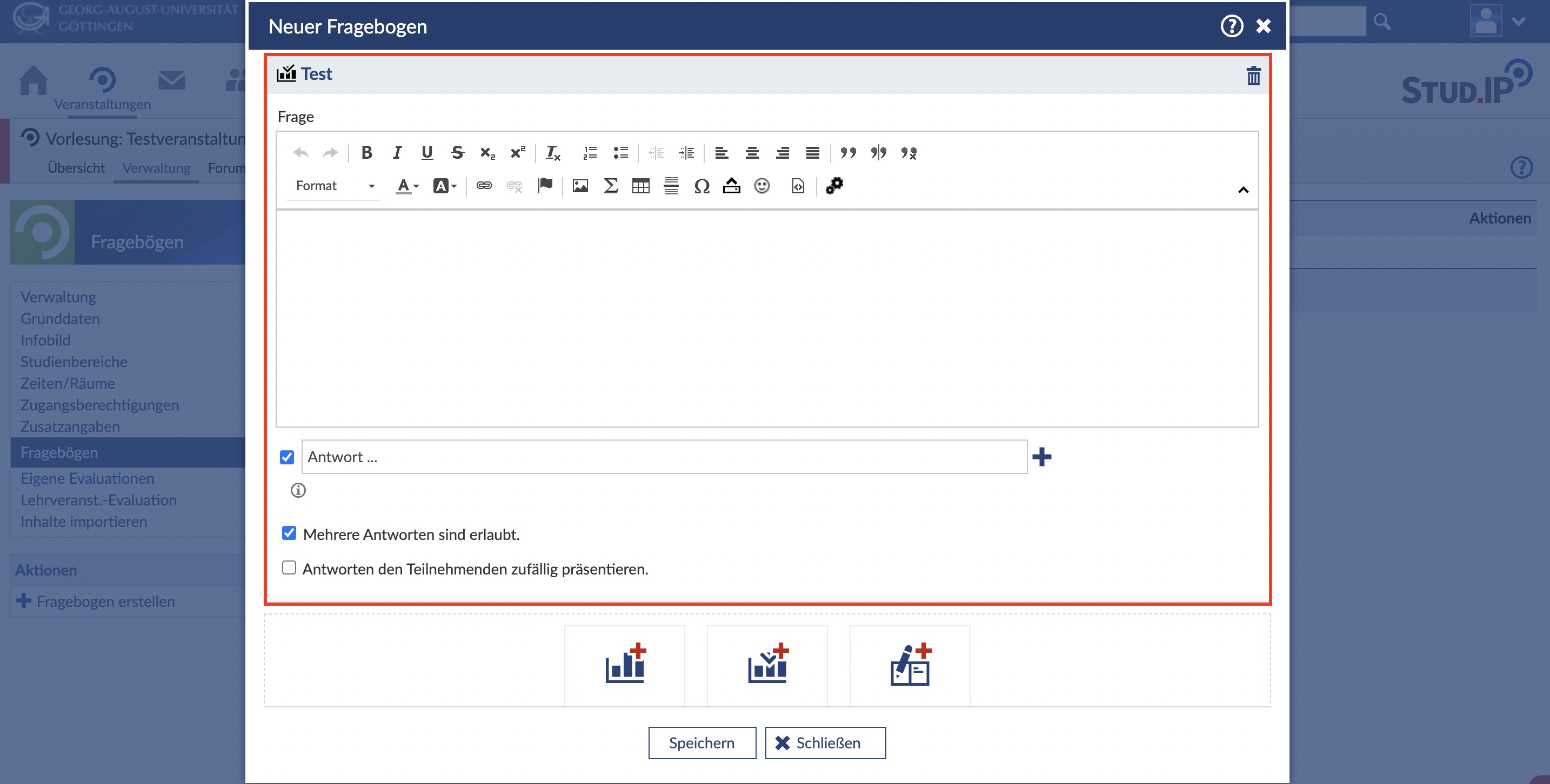 Es erscheint ein neues Tool in Ihrem Fragebogen. Geben Sie Ihre Frage und Ihre Antwortmöglichkeiten in die entsprechenden Felder ein. Denken Sie daran, die richtige Antwort mit einem Häkchen zu versehen.