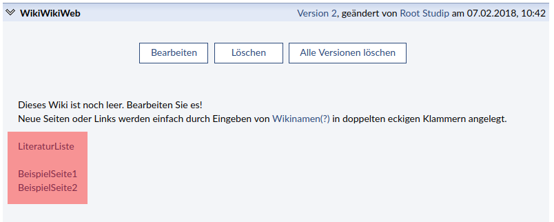 Sie können eine Seite im Wiki anlegen, indem Sie den Titel der Seite zwischen zwei eckige Klammer setzen.