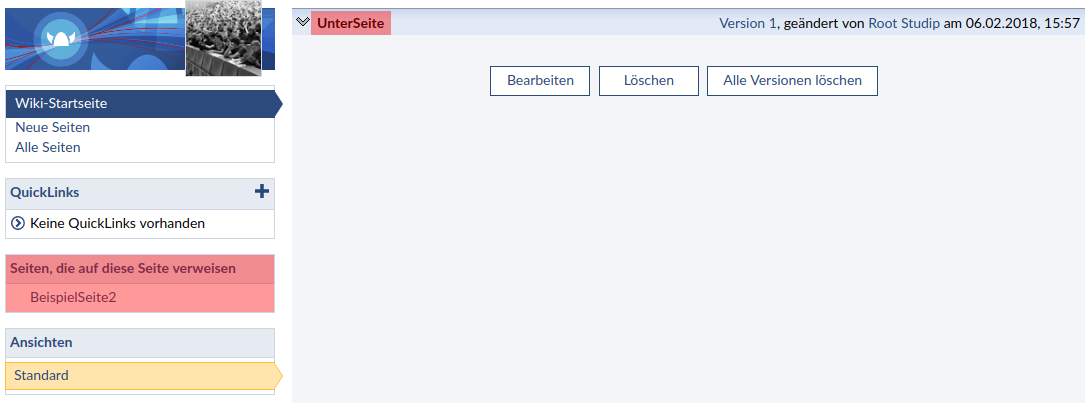 - Ihre Seite wurde angelegt. Wenn Sie nun auf den Link "Wiki-Startseite" klicken, erscheint der Link zu Ihrer Wikiseite nun ohne das (?).