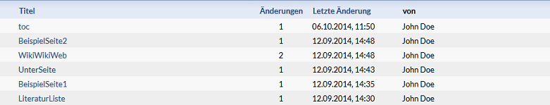 Ähnlich wie die Übersicht neuer Seiten funktioniert die Auflistung aller Seiten. Sie finden den Menüpunkt ebenfalls im linken Menükasten unterhalb von dem Menüpunkt "Neue Seiten". Es werden dann alle Seiten aufgelistet. Durch Klick auf die Spaltenüberschriften haben Sie die Möglichkeit, die Liste nach Seitentitel, Anzahl der Änderungen und nach letztem Änderungsdatum sortieren zu lassen.