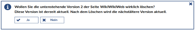 Sie bekommen dann einen Hinweis auf die Folgen der angeforderten Löschaktion: Es kann entweder die vor der aktuellen Version liegende Version aktuell werden, oder, falls keine weiteren Versionen vorhanden sind, die gesamte Wiki-Seite gelöscht werden. Bestätigen Sie den Löschwunsch durch Klicken auf den Ja-Knopf, wenn Sie eine einzelne Version entfernen möchten. Wenn Sie eine gesamte Wiki-Seite mit allen Versionen löschen, folgen Sie dem Link "Um alle Versionen einer Seite auf einmal zu löschen, klicken Sie hier." Sie werden dann nachfolgend noch einmal aufgefordert, Ihre Aktion zu bestätigen.