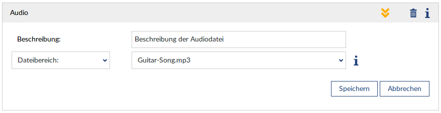 In the audio block, an audio file from the file system or from an external URL can be integrated into courseware. The courseware audio player enables the functions play, pause and stop. Fast forward and rewind is possible via the progress display.
