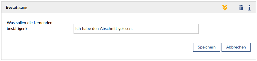 In a courseware that is to be processed sequentially, the blocks contained in a section must be processed so that the next chapter can be called. Since some blocks such as If you only have free text block, IFrame block etc. to consider this as a pass criterion, an additional pass criterion can be inserted with the confirmation block. Progress is only noted for users when they are confirmed.