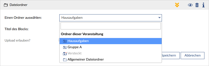 With the file folder block, a folder from the file area of the event can be integrated. The contents of the folder are listed and made available for download. The upload of files can optionally be allowed. This option is always active when a homework folder is selected.
