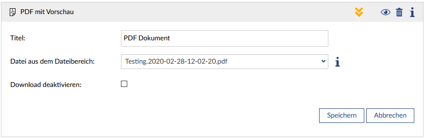 The PDF block can display PDF files from the file system. The file can be browsed through and downloaded as usual.