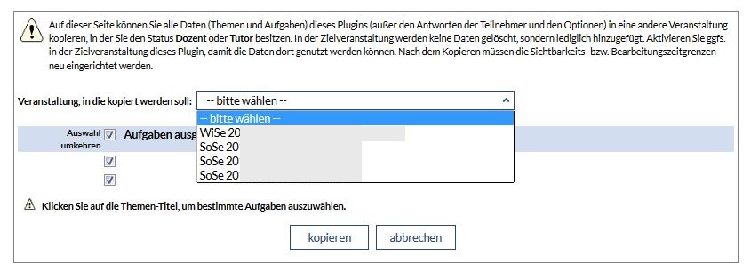 You can copy all themes ans tasks of the DoIt-P (ecept the answers of the partiticipans and the options) into a course where you have a lecturer or a tutor account. Choose which data you want to copy and within which course that should happen.