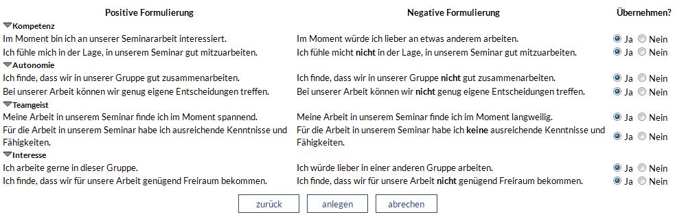 Answering the motivotioring questions is the same like in school.At the screen Standard-Questions you can choose which questions you want to create- Therefor you need to choose "yes" if you want to create it and "no" if you do not.
