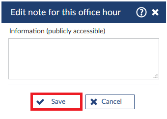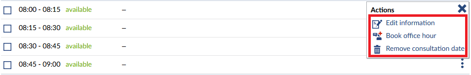 Here, you can delete an unbooked office hour. Please be aware that already reserved consultation dates need to be cancelled, before they can be deleted. You will need to confirm the deletion.