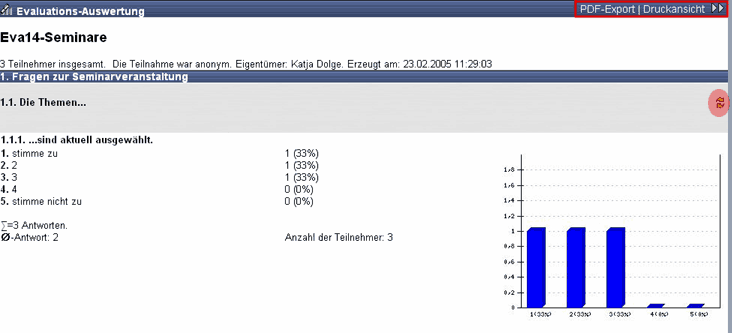 You can have your evaluation analysed by Stud.IP. Both the absolute and percentage frequency are stated. Additionally, the frequencies are presented graphically. You can also have the evaluation output as a PDF file.