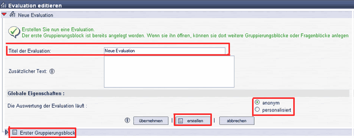 In Area 1 you can prepare new evaluation templates. In this context, we are not yet dealing with the publication but merely with the preparation of the template which can be used for publication after you have prepared it.
