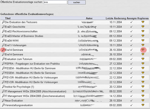 In Area 2 you can search for existing templates in Stud.IP. Templates which have been found are displayed in this area. You can then modify them and subsequently publish them. Thus, you do not have to prepare the templates yourself. This is normally the most efficient way to perform evaluations.
