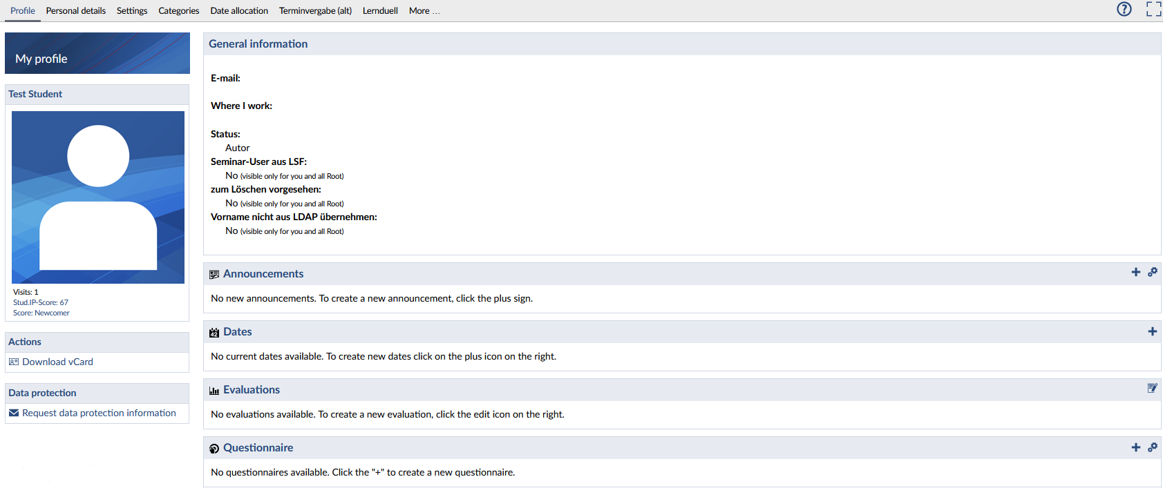 In the area next to your picture, your personal and university data will appear. For university employees, this information (organizational data) is automatically taken from EXA, and for students, the study program data is automatically displayed here. In the area below your picture, you will find a visitor counter that shows how many users have already viewed your profile. Below that, your Stud.IP score and your current Stud.IP rank are displayed. A click on these lines will take you to the score list. Additionally, you have the option to download a so-called "vCard". This contains all the data that the user has provided on their profile (name, email address, phone number, etc.). vCards can be automatically integrated into address management systems like Outlook. This entry also appears on the profile pages of other users.