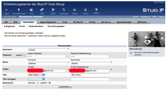 Depending on the installation, it may not be possible for you to change some entries, e.g. the user ID. If changes in such blocked fields are necessary, please contact your local Stud.IP administrators (can be found in the "Legal details" section). Under “Title“ you can select an academic title, which is to be placed before or after your name (e.g. "Prof. Dr. Irmtrud Müller-Fröhn" or "Heribert Weizenkeim, Dipl.Psychologe"), from a list or input it directly.