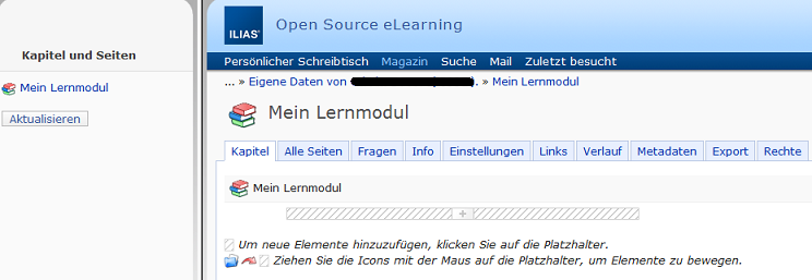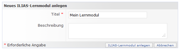 An ILIAS-learning modul is similar to a book with an index. It is made of an index and a number of chapters with a random amount of pages. First you have to give the learning unit a title. With this title you can find the learning unit in ILIAS and Stud.IP.