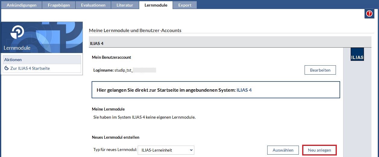 After that you have to click on the newly occured button "create new". The edit mode of ILIAS opens in a new browser tab automatically. You are now in ILIAS and you can edit the modul.