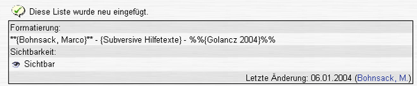 Simply enter the author’s name, the title, place and year of publication between the respective braces. Now you can decide whether only you or other visitors to your profile should be able to see the reference list. To do this select YES or NO under the "Visibility of the list" option and click on "save" to save it. If everything went well, the reference list is now on your profile.