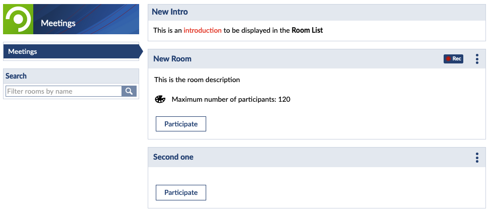 Following image is an example overview of Meetings with 2 rooms (one with recording) and a sinlge introductory text.
