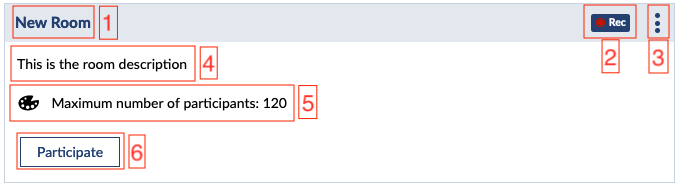 - The recording badge to illustrate that a room is being recorded. By hovering the mause over this badge more information will be shown. It is desigend to catch users attentions.