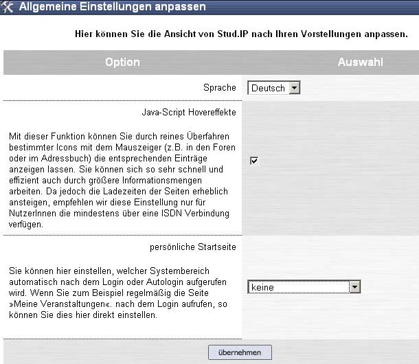 At the moment Stud.IP is available in German and English. (The English HELP feature is now being translated.) The language which your browser requires as standard language is set as default. If you are surfing with a German-language browser, you will also see Stud.IP in German. If you use an English browser, English texts will also be shown. You can select your language of choice with the “Language“ Option.
