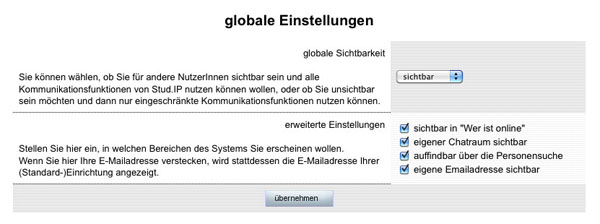 In some cases you will not be able to change the visible setting: This depends on the global configuration of the system, which is performed by the administration of your Stud.IP installation.