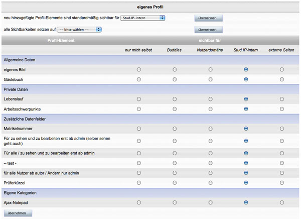 In addition to your global visibility in Stud.IP, you can also specify for whom every individual element of your profile page is visible. The lists displayed there are automatically generated from the data fields you have filled, i.e. if you have not entered any data in the “Curriculum Vitae” field you cannot set the visibility for that field because the field does not appear in the list shown above.