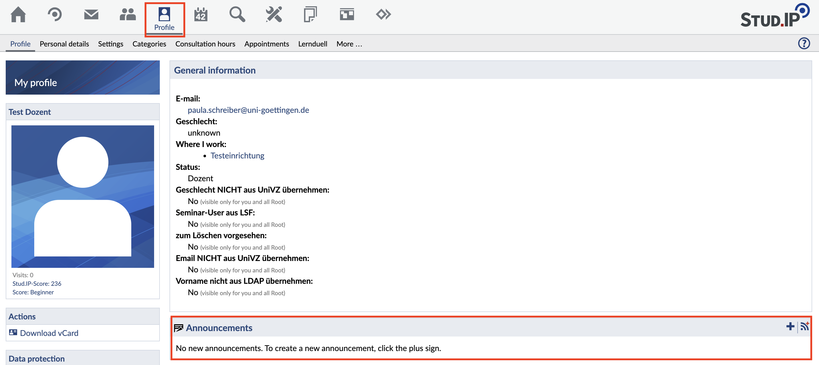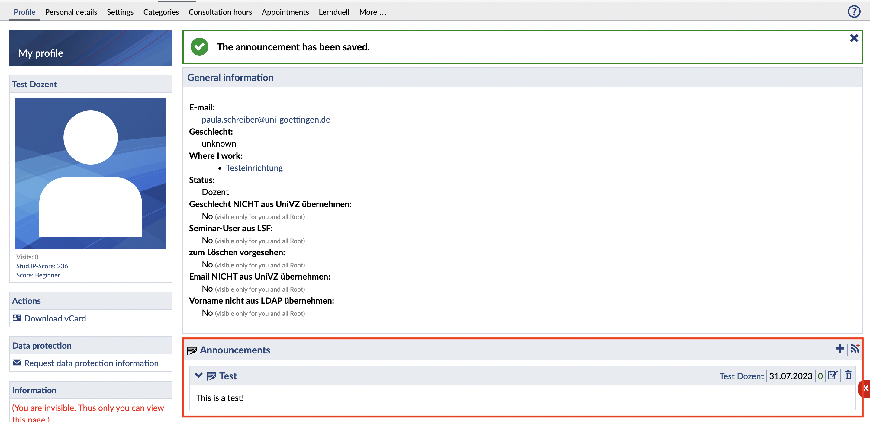 Is your office hour changing? The event is cancelled? Is there an interesting lecture that you would like to point out to the students? Use the announcements to communicate such events to all participants of your event or to all visitors of your profile.