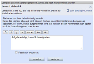 Within your journal you have the posibility to talk with lecturers or other participants about the learning progress.