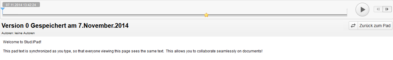 Version History: After every change within the text a new version of the text got saved in the background. By means of this button you can see the process of the text and you can jump to every arbitrarily point of time of the text. Click within the view on the play button to acctuate the changes of the text in something like a "video". Click on the - Symbol to export a specific version. With a click on "back to pad" you will get to the actuall version of the StudIPad.