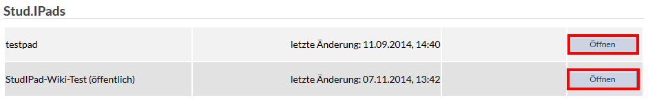 Click on the StudIPad symbol on the plugin board of your course () or on the -Symbol in the course overview to have the set StudIPad of the course advised. Subsequently you can open the StudIpad by clicking on the "open" button.