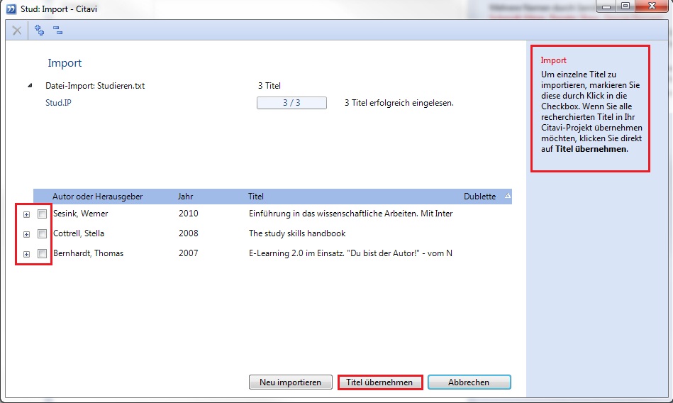 6. Now you can choose wehter you want single (if there is a long list of references) or all title to be imported. Click on "apply titel", do your selection and confirm with "OK".