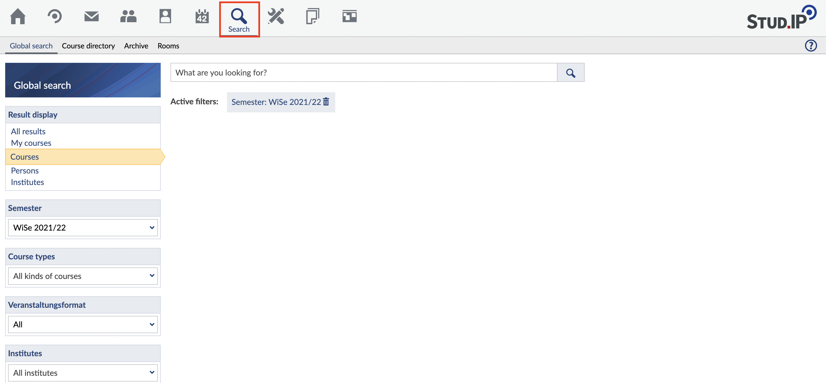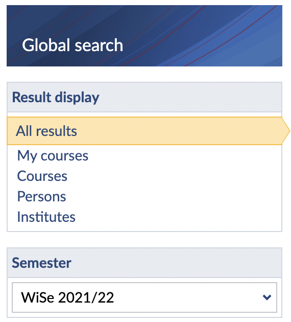 If you search in the field "my courses" you will find search results for the courses in which you are registered. If you search in the field "courses" you will find all courses registered in Stud.IP. If you search in the field "persons" you will find all persons registered in Stud.IP. If you search in the field "institutes" you will find all institutes registered in Stud.IP.