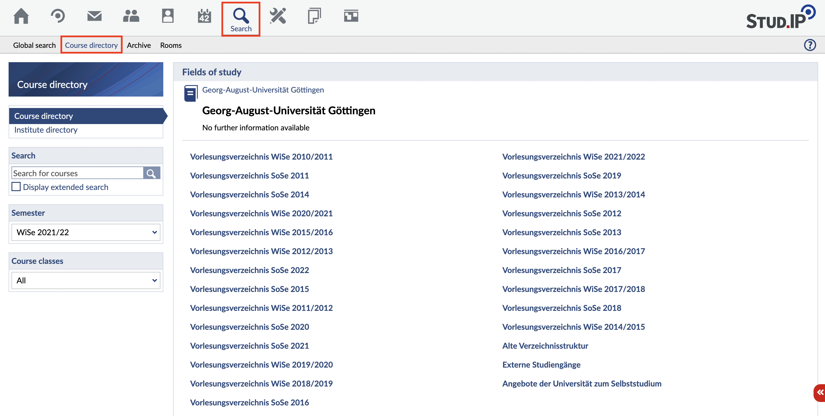 In the directory you will first get an overview of all course directories. Select the directory of the semester in which you are looking for the course. The current semester is ideal for this.
