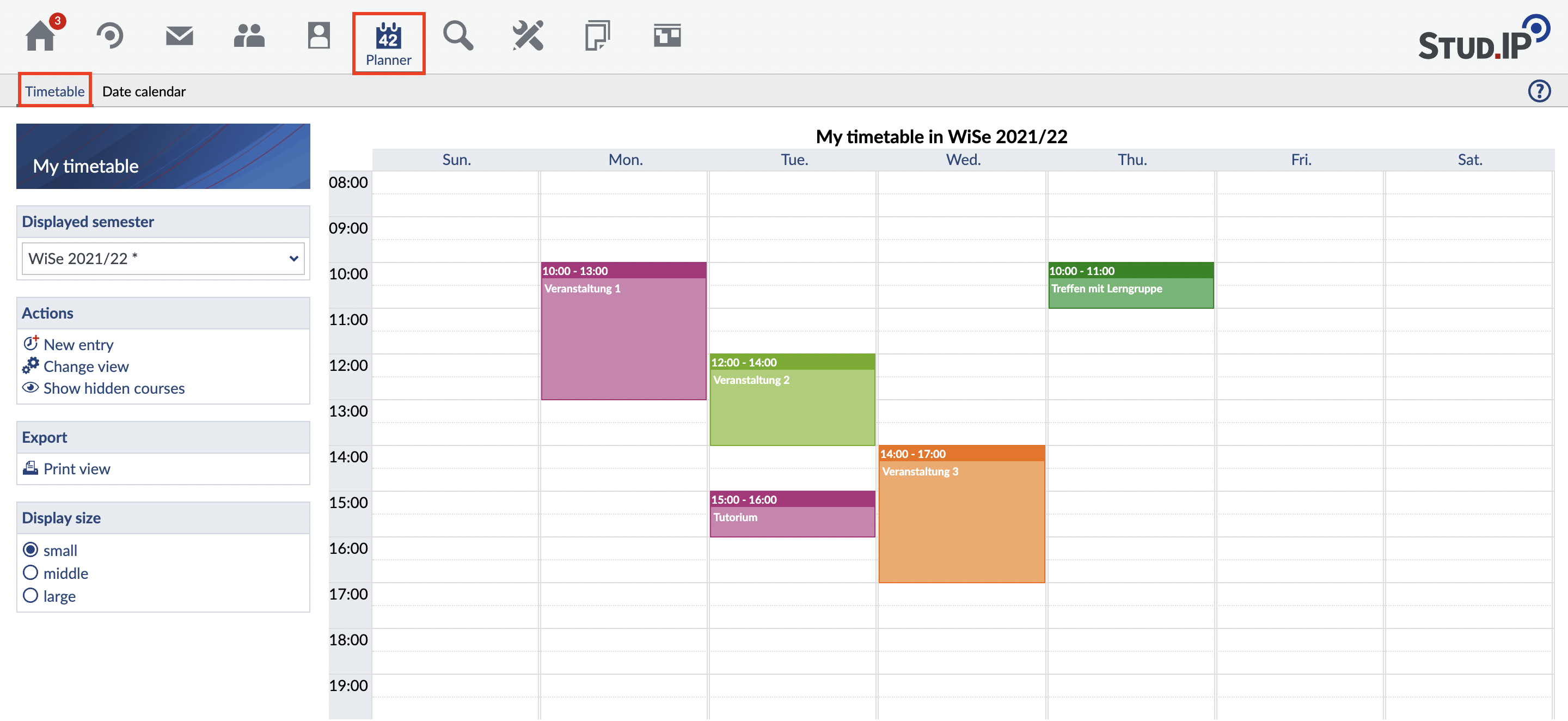The Appointment calendar in Stud.IP functions like a time planner made of paper, but it has decisive advantages. It is more flexible and easier to adapt than its counterparts in the real world. And it is more secure than all other appointment calendars which you have perhaps previously encountered in the computer field. Your appointments are securely safeguarded against prying eyes on the Stud.IP server. Thus, you not only have access to your appointments from every Internet-capable computer in the world, but you can also be certain that even in the event of a sudden system crash or virus infestation of your computer your time planning data will not be lost.