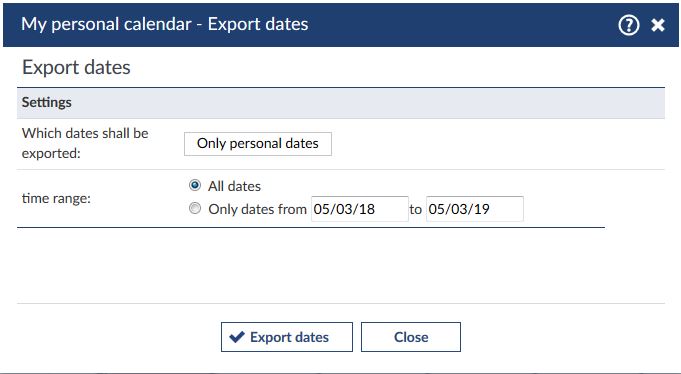 Here you can export your appointments. Here you can choose if you want personal appointments, just course appointments or if yiu want to export all appointments. Additionally you can decide from whitch time cap appointments should get exportet that means if all appointments should get exported or just some from a specific time period (i.e. one semester). Therefor you choose all appointments or you choose a specific time cap and confirm your selective by clicking on the button "export appointment".