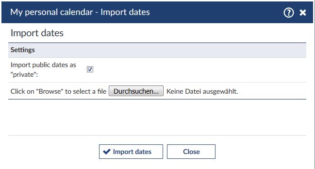 Here you can import appointments that are in a iClanedar-dataset. Click on "browse" to choose the files and then click on "imort file" to upload the choosen file.