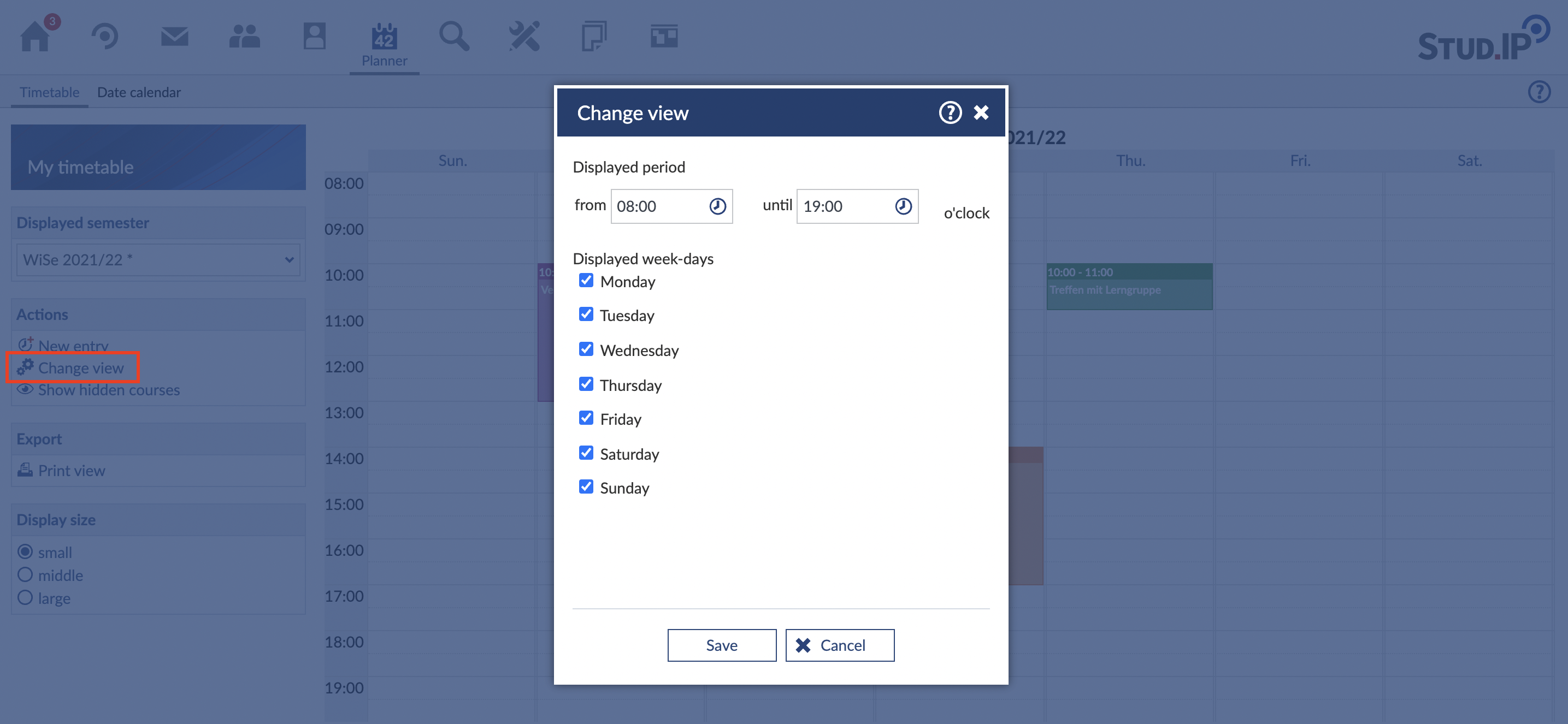 - You can specify from which starting time to which ending time a day in your timetable should be displayed. All time periods between 0:00 and 23:00 hours are possible; the subdivision is in hourly intervals.