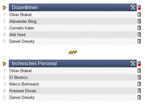 Assign the marked users to one of the established groups by clicking on the yellow double arrow just to the left of the appropriate group header. The person now appears in the group. You can rescind the assignment using the Waste bin on the right side. Naturally, the person still remains a participant in the course.