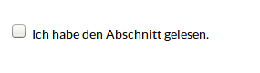 In einer Courseware die sequentiell abgearbeitet werden soll müssen die in einer Sektion enthaltenen Blöcke bearbeitet werden damit das nächste Kapitel aufgerufen werden kann. Da manche Blöcke wie z.B. Freitext-Block, IFrame-Block etc. nur das betrachten als Bestehenskriterium haben, kann mit dem Bestätigungs-Block eine zusätzliches Bestehenskriterium eingefügt werden. Erst wenn der Nutzer bestätigt, dass er die Sektion bearbeitet, gelesen und oder betrachtet hat, wird die Sektion als erfolgreich bearbeitet vermerkt.