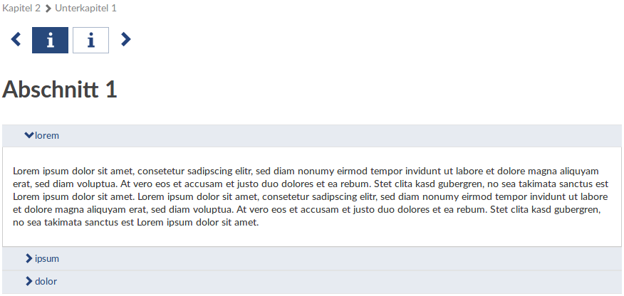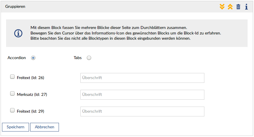 Der Gruppierungs-Block fasst optisch mehrere Blöcke zusammen. Es ist eine Darstellung in einem sogenannten Accordion oder in Tabs möglich.